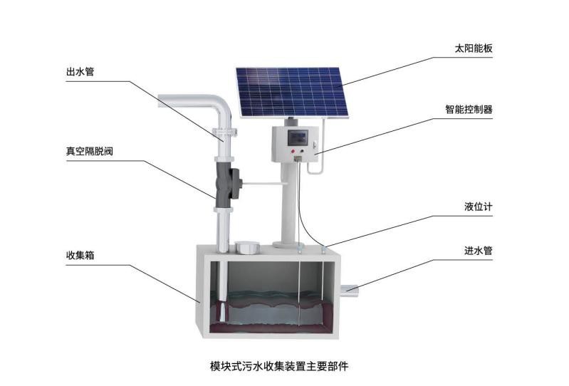 模块式污水收集装置是整套负压排水系统的核心控制元件,也是负压排水系统得以实现的关键设备。模块式污水收集装置根据现场情况灵活安装,设备采用中部进水,上部出水的设计。进水口有四个方向,可根据现场情况灵活调整安装方式。此设备主要功能是控制收集的污水有序进入负压管网,无空气进入。
